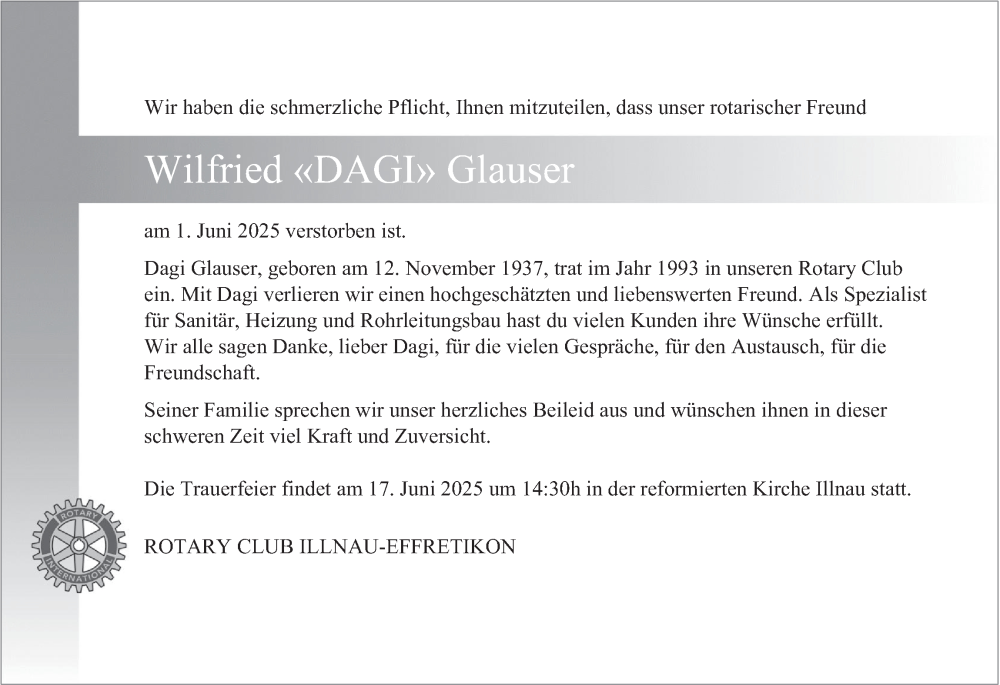 Hier finden Sie alle Traueranzeigen aus der Zeitung, die bisher für Wilfried Glauser erschienen sind. Weitere Traueranzeigen, die in der Zeitung erscheinen, werden hier ebenfalls aufgelistet