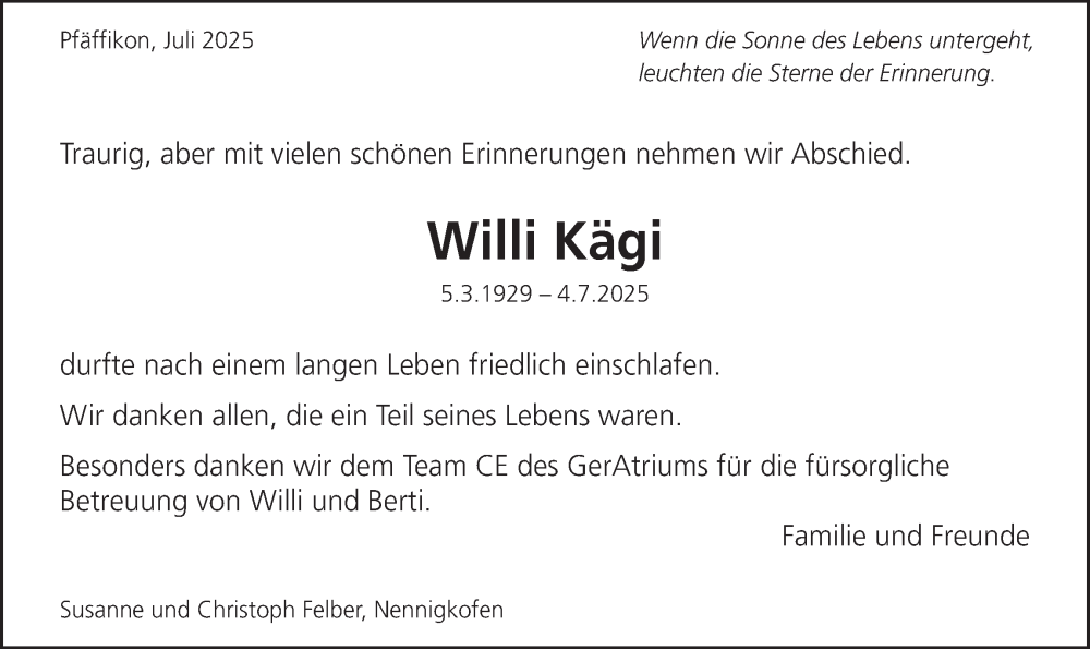 Hier finden Sie alle Traueranzeigen aus der Zeitung, die bisher für Willi Kägi erschienen sind. Weitere Traueranzeigen, die in der Zeitung erscheinen, werden hier ebenfalls aufgelistet
