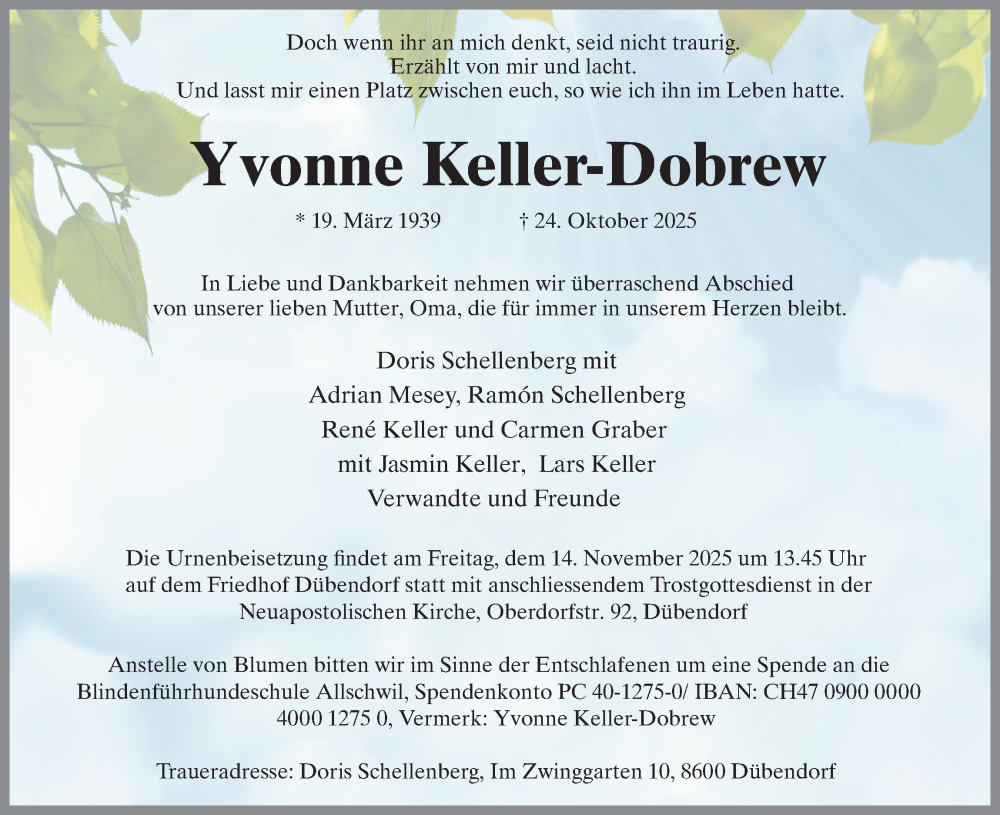 Hier finden Sie alle Traueranzeigen aus der Zeitung, die bisher für Yvonne Keller-Dobrew erschienen sind. Weitere Traueranzeigen, die in der Zeitung erscheinen, werden hier ebenfalls aufgelistet